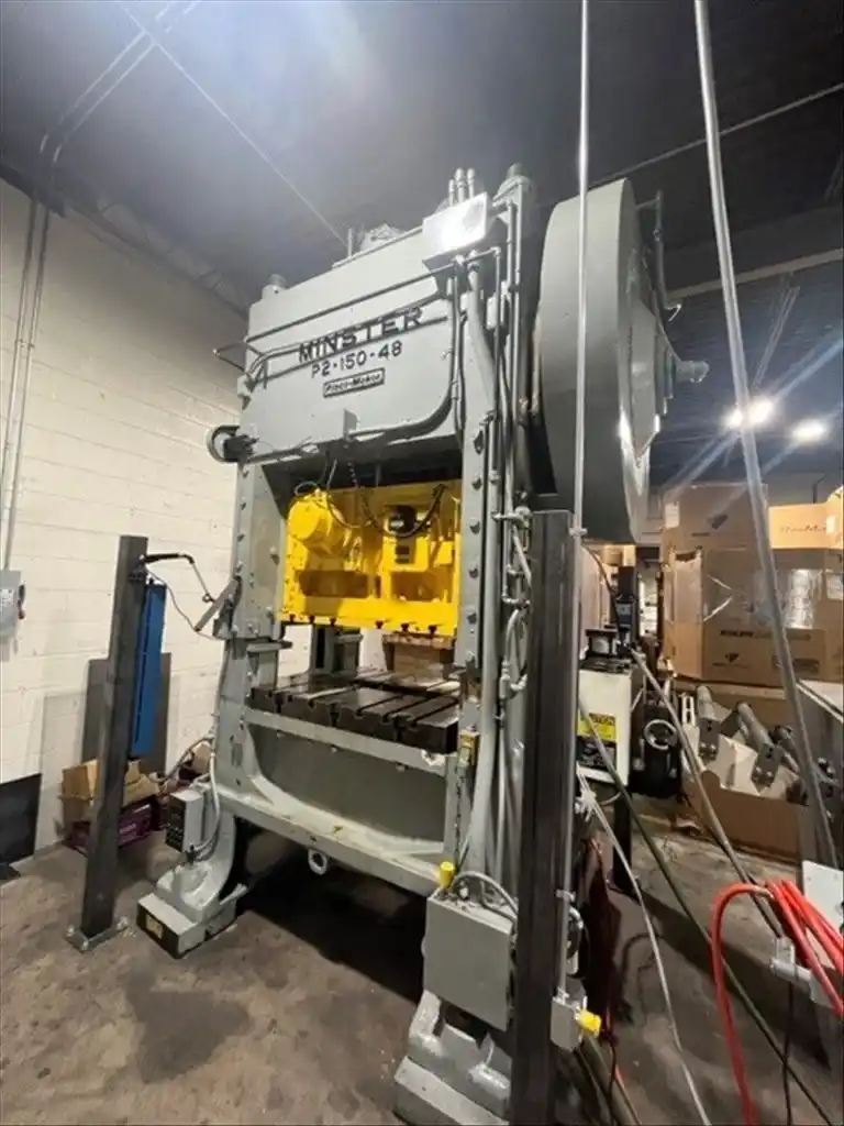 Tonnage 150 tons, Stroke 5.00 inches, Shut Height 21.00 inches, SPM 150, Vari Speed (Yes/No) yes, Bed W 40 inches, Bed L 48 inches, Crank (Single/Double) double, Air Clutch (Yes/No) yes, Type of CNC Control Minster, Dimensions 166"T x 104"W x 82'D, Weight 45500 pounds, Minster P2-150-48, Tonnage 150, Stroke 5.00 ...more