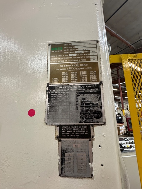 150 Ton, Minster #P2-150-54 PieceMaker, double crank sngl side press, 6" stroke, 23" Shut Height, 45-90 SPM, 4" adj, 54" x 40" bed, 60 psi air clutch, servo feed w/ console Manufacturer: Minster Model: P2-150-54 Ton: 150 Stroke: 6.0 Shut Height: 23.0 Air Clutch: Yes Stock # 7773 Price: $82,500 USD - Finance for as low as $1,673/mth Estimated monthly payment valid upon approved credit. Request Info 6 For Sale by Wheeler Machinery Sales Surplus Record Dealer Since 1998 Contact Seller Pomona, CA Dan Wheeler 909-34...> Show Seller's Phone Number 909-348-5610 Let the seller know you found their listing on Surplus Record! View More Wheeler Machinery Sales ' ListingsDescription 150 Ton Minster P2-150-54 Piecemaker Straight Side Punch Press #7773SPECIFICATIONS:Tonnage: 150 TonsStroke: 6"Strokes/Min: 45-90 SPMBolster Area: 54" x 40"Shut Height on Bed Stroke: 23"Slide Adjust: 4"Clutch Air Pressure: 60 psiEQUIPPED WITH:Dual Palm Button Control & ConsoleCoe Servo Master Feed w/ ConsoleDi Pro 1500 Press MonitorPay Off Reel Request More Information from SellerInquire Further with Wheeler Machinery Sales! "*" indicates required fieldsName*Company*Email* PhoneZip / Postal Code*QuestionMake an OfferRequests Send me a shipping quote I am interested in financingSend Copy Email me a confirmation of this inquiryBuyer Protection Use our partner Escrow.com to buy or sell equipment safelyBuyer Protection Send me info about buyer protectionThis field is hidden when viewing the formDealer Email Buyers Who Viewed This Listing Also Viewed … 150 Ton, Minster #P2-150-54 PieceMaker, straight side double crank press, 23" Shut Height, 4" adj, 54" x 40" bed, 45-90 SPM, air clutch & brakeCategory: Straight Side Double Crank (Single Act...Seller: Southern Fabricating Mchy SalesLocation: Lithia, FL Mfr: MinsterModel: P2-150-54150 Ton Piece-Maker Geared Straight Side Press with Motor / Electrics / Controls, T-Slotted Bolster, T-Slotted Slide, Air Clutch and Brake, Capacity: 150 Ton, Stroke: 6", Shut Height On Bed: 23" (SDAU), Slide Adjustment: 4", Bed Area: 54" L-R x 40" F-B, Speed: 45-90 SPM, Windows: 19" ...more 150 Ton, Minster #P2-150-54, straight side punch press, 6" stroke, 23" Shut Height, 4" adj., 45-90 SPM, 60 psi air clutchCategory: Straight Side Double Crank (Single Act...Seller: Blackstone MachineryLocation: Cerritos, CA Mfr: MinsterModel: P2-150-54Year: TBD, Make: Minster, Model: P2-150-54, Tonnage: 150 Tons, Stroke: 6", Strokes/Min: 45-90spm, Bolster Area: 54" x 40", Shut Height on Bed Stroke: 23", Slide Adjust: 4", Clutch Air Pressure: 60psi, Weight: TBD, Dimensions: TBD, Dual Palm Button Control, *Personal inspection of all equipment ...more 150 Ton, Minster #P2-150-54, straight side double crank, 6" stroke, 23" Shut Height, 4" adj., 45-90 VSPM, 54" x40" bed, 20" window, air clutch & brake, 1971Category: Straight Side Double Crank (Single Act...Seller: Nidec Press & AutomationLocation: Macomb, MI Mfr: MinsterModel: P2-150-54Year: 1971Tonnage 150 tons, Stroke 6.00 inches, Shut Height 23.00 inches, SPM 90, Vari Speed (Yes/No) yes, Bed W 40 inches, Bed L 54 inches, Crank (Single/Double) double, Air Clutch (Yes/No) yes, CNC Control yes, Type of CNC Control Original Minster control, Dimensions 163T x 110W x 82D, Weight 48500 pounds, 150 ton Capacity 6" ...more 150 Ton, Minster #P2-150-54, straight side double crank, 6" stroke, 23" Shut Height, 4" adj., 45-90 SPM, 20.5" window, 54" x40" bed, air clutch & brake, 1976Category: Straight Side Double Crank (Single Act...Seller: Rygate, LLCLocation: Clarkston, MI Mfr: MinsterModel: P2-150-54Year: 1976MINSTER P2-150-54, Tonnage. 150 T, Stroke. 6", Shut Height. 23", Bed area (Left to right). 54", Bed area (Front to back). 40", SPM min. 45 strokes/min., SPM max. 90 strokes/min., Adjustment. 4", Windows Width. 20.5", Air Clutch and Brake, Air Counterbalances, T-Slotted Bolster and Ram, 8 Point Gibbing, Motorized Ram ...more 150 Ton, Minster #P2-150-54 Piece-Maker, straight side double crank high speed mechanical stamping press, 6" stroke, 23" Shut Height, air clutch, refurbishedCategory: Straight Side Double Crank (Single Act...Seller: S & G Press & Machinery SalesLocation: Shelby Township, MI Mfr: MinsterModel: P2-150-54Tonnage 150, Stroke 6 inches, Shut Height 23 inches, Adjustment 4 inches, Bed Size 54" x 40", Ram Area 54" x 23", SPM 45-90 VSPM, Standard Minster P2-150 Piece-Maker, Serial Number 23153 Mechanical Metal Stamping Press 150 ton Capacity 6" Stroke 23" Shut Height 4" Adjustment 54" LR x 40" FB Bed Area 54" LR x 23" FB ...moreShare × "*" indicates required fieldsYour Name*Your Email* Recipient's Email* Note to Recipient