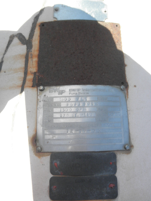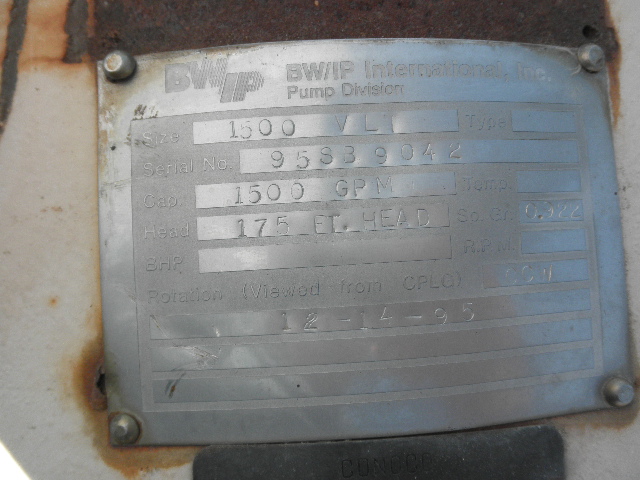 | Description: | Used Byron Jackson 1500 VLT Centrifugal 2 Stage vertical turbine pump, Sp. Gr. - .922, rotation CCW, date 12-14-95 |