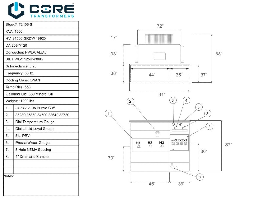 1500 kva, Primary Voltages GRDy, 14400, 13800, 13200, 12470, 12000, 11700, 480y277 v Secondary, 3 ph, 60 Hz, Mineral Oil.