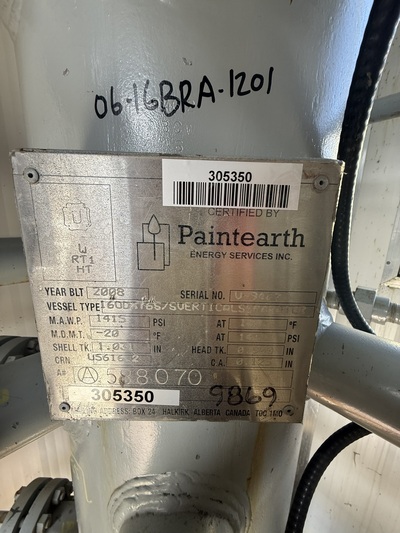 Available for sale: A vertical, portable sour separator with a diameter of 16 inches and designed for three-phase service. Manufactured by PAINTEARTH ENERGY SERVICES in 2008, this unit features a maximum pressure rating of 1415 psi and is operationally connected. Located in Edson, AB, Canada, it includes a meter run manufactured by CANALTA CONTROLS LTD with a diameter of 3 inches and an ANSI rating of 600.