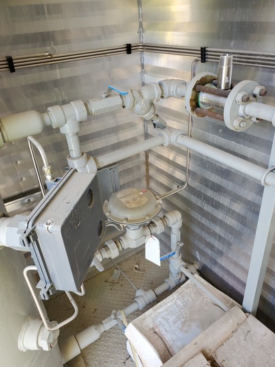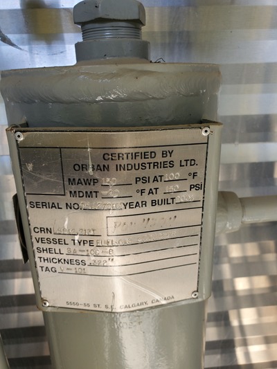 For sale: A 2004 ORBAN tank (CRN: L8647.213) with a capacity of 1000 gallons, equipped with a chemical injection pump. This vertical unit is designed for sweet service, featuring a maximum pressure of 1440 psi and a maximum temperature of 100°F. The tank has a diameter of 16 inches and is portable, housed in a heated building measuring 12.5 ft wide, 15 ft high, and 14 ft long in Grande Prairie, AB, Canada. Operational status: Disconnected.