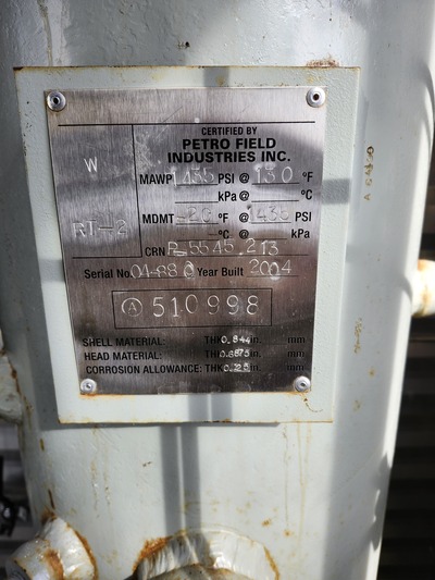 For sale: A portable and housed vertical separator manufactured by Petro Field Industries in 2004. This unit has a diameter of 16 inches and a length of 90 inches, with a maximum pressure rating of 1435 PSI and a maximum temperature rating of 130°F. Currently in condition 'C', it requires maintenance but is ideal for sweet service type applications. Located in Rocky Mountain House, AB, this three-phase separator is disconnected and ready for your operational needs.