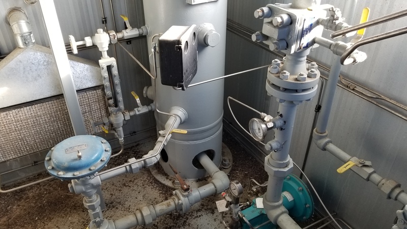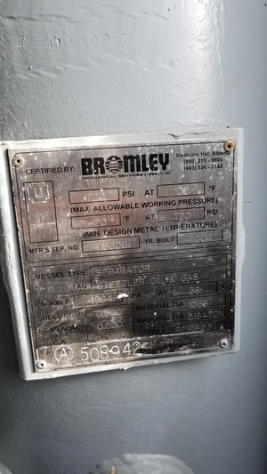 Available for sale: A RJV Gas Field Services separator designed for sweet service types. This vertical separator s a diameter of 16 inches and a length of 5 feet, with a maximum pressure capacity of 720 PSI. Built in 1997 and currently disconnected, this unit is housed and portable, located in Meota, SK, Canada. ...more