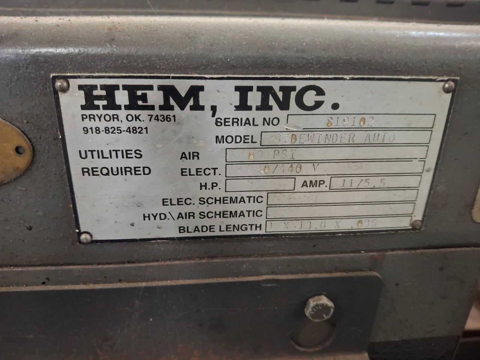 HE&M Horizontal Pivot Miter Bandsaw, Model: Sidewinder A-4, Capacity 16” W X 12.75” H, 10” W X 10” H @ 45° (L), Blade 1” X 13.6” X.035”, Motor 3 HP, Operation Automatic, Bar-Feed 0-24” Stroke Air (4 Index), Optional s Included, 5’ X 18” Idle Non-Panned ...more