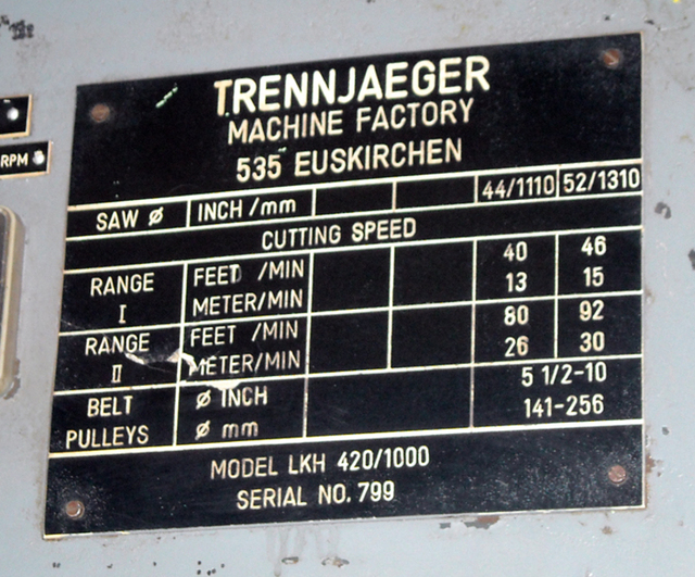 Pre Owned Kaltenbach Model KKS-401NA, Serial Number: 117-759New 1996, Capacities, flats16" x 18”, @ 90 Degrees9.5” X 3.14”, @ 45 Degrees7.28 X 2.36”, rounds5.9”, Blade Size17.7”, Blade Speeds Approx7 - 43 RPM - 15 - 75 RPM, Blade Feeds0- 39” Per Minute, electrics5 HP 1800 RPM ...more