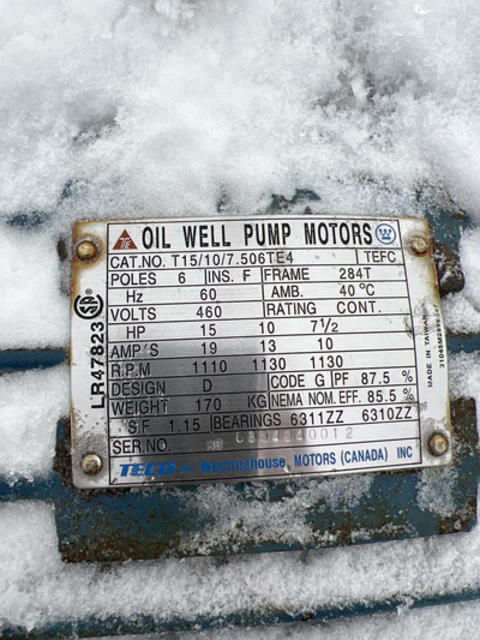 For sale: Legrand Electric Pump Jack (Model Number: 160-163-64) built in 1988. This unit features a cement base and is operationally connected. It includes VFD details with WerMac Electric specifications (SN-97051770-10, Model# G5U 4011 PJ, 15HP/460V/1-3PH/60Hz). Located in Grande Prairie, AB, Canada. Warranty not included.