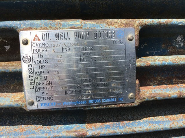Explore the high-performance Westinghouse 20HP pump jack driver, featuring a robust design with an operating speed of 870 RPM. This electric-driven unit, manufactured by Lufkin, is ideal for various applications. Located in Stoughton, SK, Canada. Serial No: F10831-474235. Note: No VFD or warranty included..