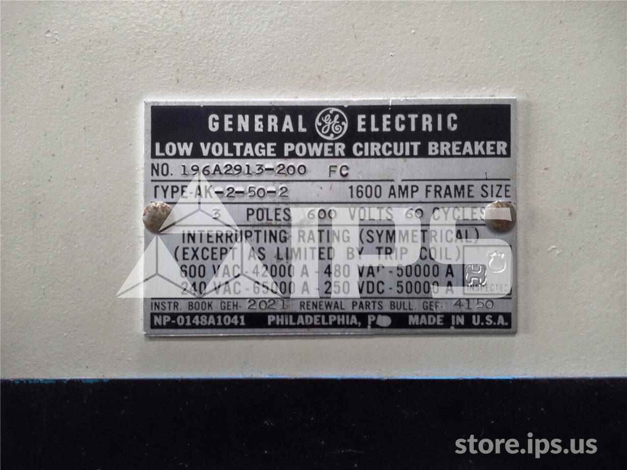 Brand: GE, Condition: USED, "AS-IS", Model: AKR-ND-50, Type: LOW VOLTAGE POWER CIRCUIT BREAKER, Serial: AK65931, Power Rating: 1600 AMP, 635 V MAX, 3 POLE, 50/60 HZ, Weight: 252 LBS. W/ PALLET, Category: AIR / VACUUM BREAKERS, ERC #: MO-4096, Job #: 091, Additional Notes: -.