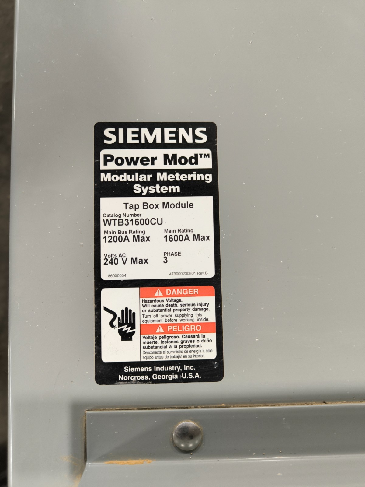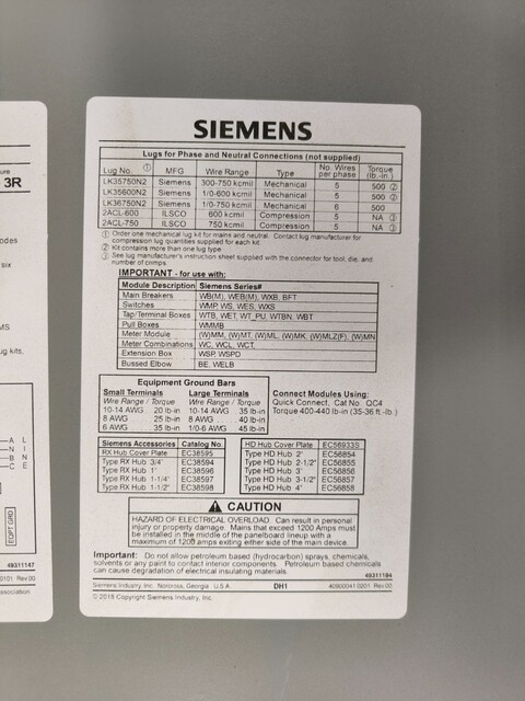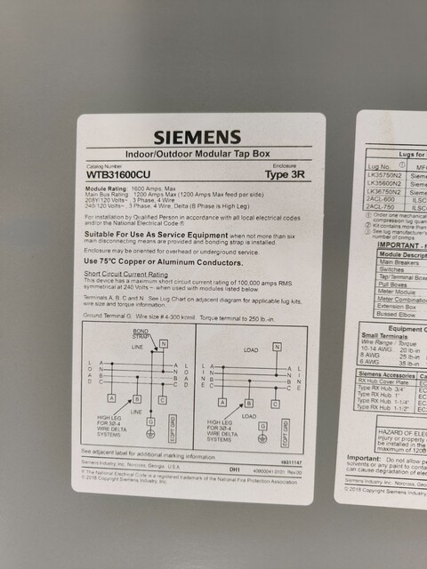 Siemens Power Mod WTB31600CU Tap Box Module 1200 A Bus 1600 A Main 240 VAC 3 PH