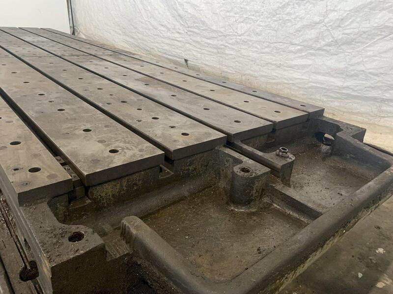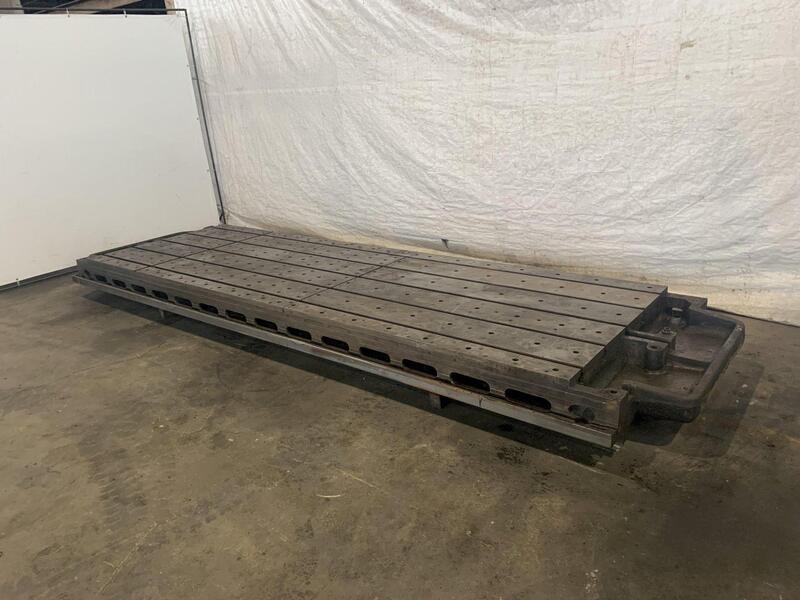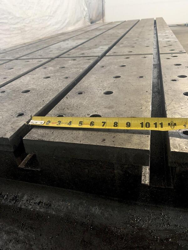 LENGTH OF PLATE #1. 154", WIDTH OF PLATE #1. 57", LENGTH OF PLATE #2. 154", WIDTH OF PLATE #2. 57", TOTAL LENGTH OF PLATES TOGETHER. 25'6" END TO END, PLATE THICKNESS. 12", HEIGHT OF PLATE ON STAND. 30, NUMBER OF T SLOTS. 5, T SLOT CENTERS. 11-1/2", T SLOT WIDTH AT TOP. 1-1/4", T SLOT DEPTH. 2-1/4", T SLOT WIDTH ...more