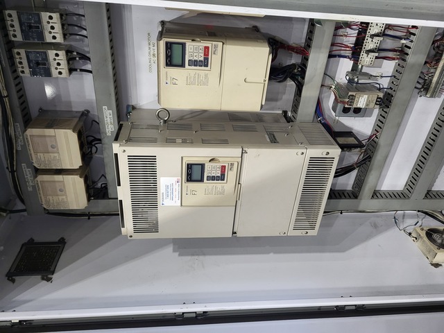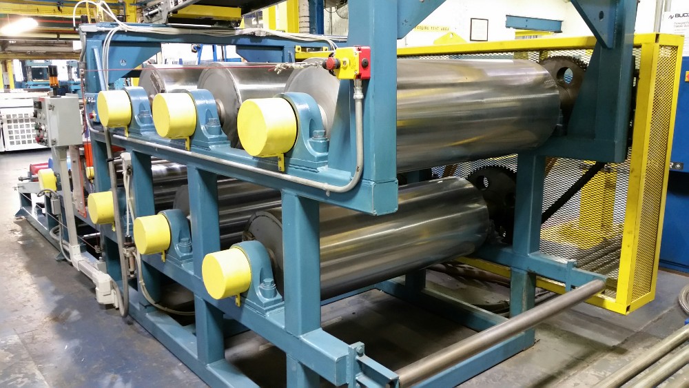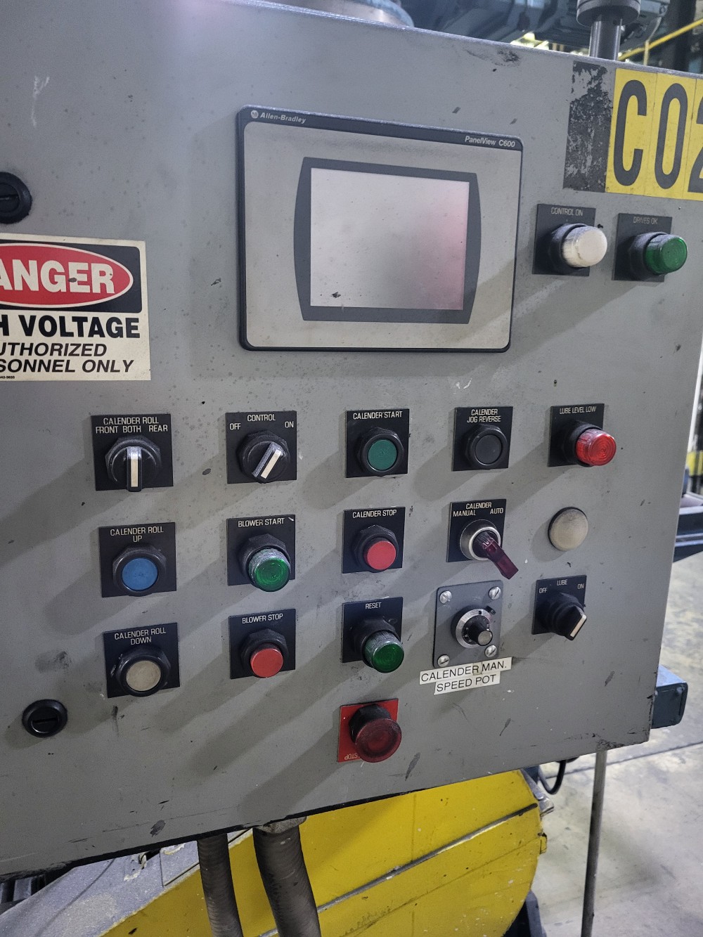 Almost new 16" x 16" x 48" 2 roll vertical calender for rubber, plastic, or silicone. Solid steel end frames and steel bearing housings 50hp variable speed AC Frequency motor with 480 volt AC variable speed drive. 0-25 RPM. Roller bearings on all 4 journals. Even speed herringbone connecting gears. Motorized top roll. Fixed bottom roll. Nylon stock guides. 6 drum cooling drum stand with cooling fans which runs at the same speed the calender rolls run. at Calender line was new in 2015 and has less than 100 hours use.