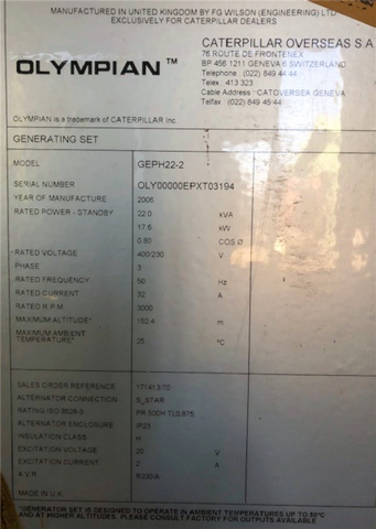 17 KW Olympian #GEPH22-2, Generator, 22 KVA, 3000 RPM, 2006 Manufacturer: Olympian Model: GEPH22-2 Year: 2006 kW: 17 Stock # 17K-183 Request a Quote 6 For Sale by A M King Industries Surplus Record Dealer Since 1989 Contact Seller Oroville, CA Albert King 530-53...> Show Seller's Phone Number 530-534-7965 Let the seller know you found their listing on Surplus Record! View More A M King Industries ' ListingsDescriptionOLYMPIAN Model GEPH22-2, 22 kVA Generator Request More Information from SellerGet Your Price from A M King Industries! "*" indicates required fieldsName*Company*Email* PhoneZip / Postal Code*QuestionMake an OfferRequests Send me a shipping quote I am interested in financingSend Copy Email me a confirmation of this inquiryBuyer Protection Use our partner Escrow.com to buy or sell equipment safelyBuyer Protection Send me info about buyer protectionThis field is hidden when viewing the formDealer Email Buyers Who Viewed This Listing Also Viewed … 18 KW Kohler #15REOZK, Diesel Generator Set, Sound Attenuated, 120/240 Volts, 1PH, 6.5 hours, 2021Category: Diesel GeneratorsSeller: Diesel-Powered.comLocation: East Earl, PA Mfr: KohlerModel: 15REOZKYear: 2021Stock#: IE15-123-KH Fuel: Diesel Year: 2021 Voltage: 120/240 Volts Hours: 6.5 Hours Phase: 1 Phase Make: Kohler Model: 15REOZK Serial: 337GGMJM0090 Hertz: 60 Hz Wires: 4 Lead Kilo Watts: 18 kW Mounted: Skid Mounted Fuel Tank: Base Fuel Tank Enclosure: Sound Attenuated Enclosed: Enclosed Length: 78" Width: ...more 18 KW PowerProject, home standby generator, newCategory: Diesel GeneratorsSeller: Powerhouse Systems LlcLocation: Niota, TN Mfr: Powerproject 16 KW Kohler /Yanmar #16EFOZ, Marine generatorCategory: Diesel GeneratorsSeller: Gregory Poole Equipment CoLocation: Washington, NC Mfr: KohlerModel: 16EFOZYear: 2020JUST ADDED! 20 KW Generac #MDG2-25, diesel generator set, 480 Volts, 3-phase, 2023Category: Diesel GeneratorsSeller: Global PowerLocation: Nisku, AB Mfr: GeneracModel: MDG2-25Year: 20232023 Generac MDG2 25 Generator 480/208/240 3 Phase 240V 1 Phase. 45mins of run time on the generator., Available at Global.Power Systems Nisku, www.globalpower.ca.JUST ADDED! 20 KW Magnetek #RD250, Diesel Generator, 1 & 3PH, 3.9L Perkins engine, 1455 HrsCategory: Diesel GeneratorsSeller: Quantum TechnologyLocation: Shippensburg, PA Mfr: MagnetekModel: RD250*Handling times for freight shipments average 5 days, but may vary depending on size, weight, location, and current trucking conditions. This does not include shipping time.*, Please be aware that item s are provided as-is without any warranties or guarantees of accuracy. We strongly recommend using this content as a ...moreShare × "*" indicates required fieldsYour Name*Your Email* Recipient's Email* Note to Recipient