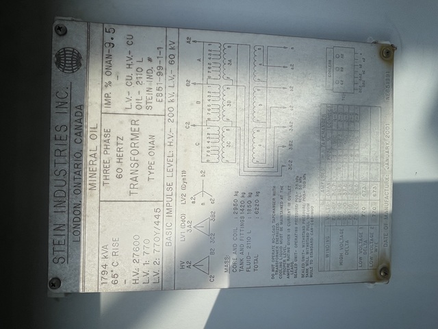 Stein 1794kVA Used transformer, HV: 27600V, LV: 770Y/445V. Tested Dec 9, 2024. Report available on request. Fully energized and functional before it's removal.Click REQUEST QUOTE anywhere you see it on our site to receive a quote, with Pricing and Specs, directly to your email!!* All Descriptions, Specifications and Features are correct to the best of our knowledge. Interested buyers should verify before purchasing.