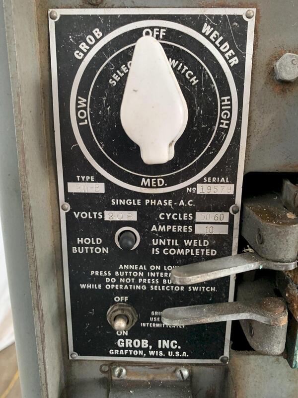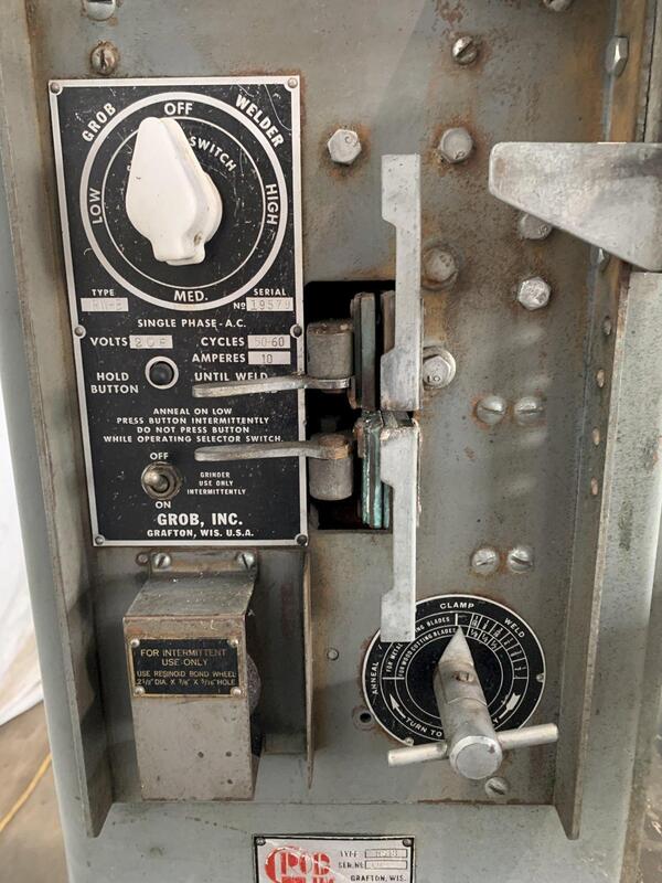 One Used GROB Vertical Band Saw Model NS18, Serial No 6775, 18" Throat, 9" Height Under Blade Guide, Tilting Table, Foot Activated Power Feed, Welder, Grinding Wheel and Shear, AC Motor and Controls, Located FOB Bridgeport, CT Warehouse.