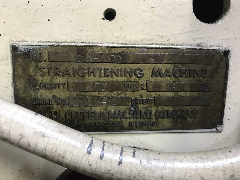 Used 18 Littell powered straightener, Model 418-5PD, From 1954. Features include max coil width 18", thickness 0.05", 5 straightening rolls, loop control arm, variable speed, and jog forward/reverse. Serial no. 55145-54.