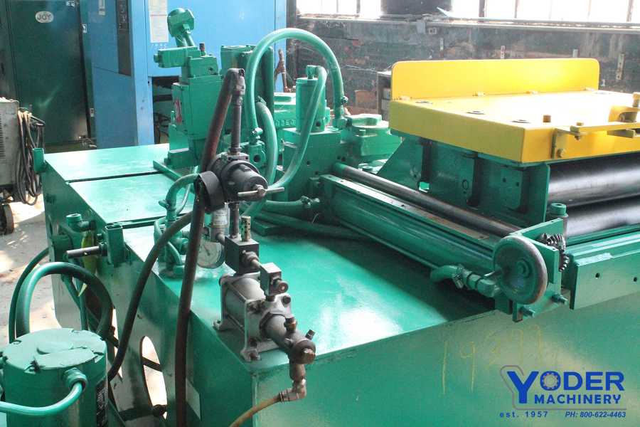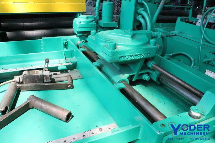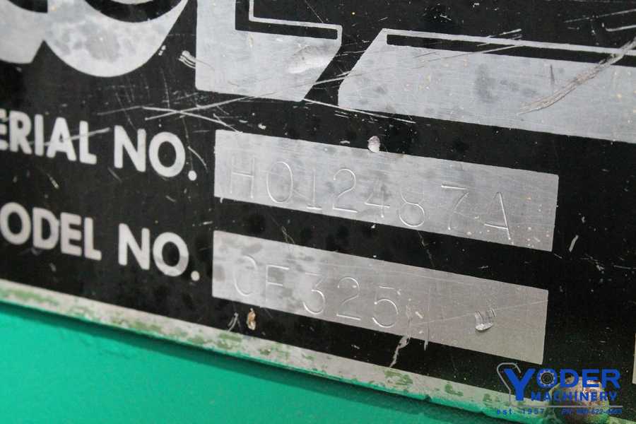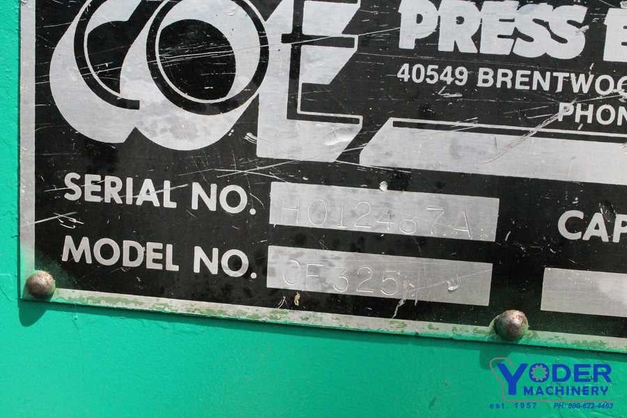SERIAL. G082200A, MODEL. CF325, AGE. 1986, STOCK CAPACITY. 18" WIDE X.125" THICK, MAX STROKE LENGTH. 18", CYLINDER BORE. 3.25", RIGHT TO LEFT FEED. YES, ZIG / ZAG STYLE FEED. YES, 5-ROLL PULL THRU STRAIGHTENER, ADJUSTABLE CABINET BASE.