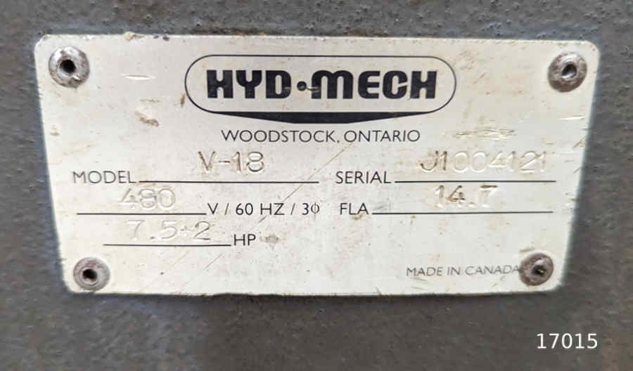 Hyd-Mech Tilting Veertical Band Saw, Model V-18 Serial J0906198 New 2001, Capacity Vertical 20", Capacity Horizontal 18", Capacity @45` 13", Blade 14'11" x 1-1/4", Blade Speed 65 to 325 SFM, Carbide Guides, Hydraulic vises, guide arm, head tilt, feed system, Motor Blade 7-1/2, Motor Hydraulic 2, Wired Voltage 440 ...more