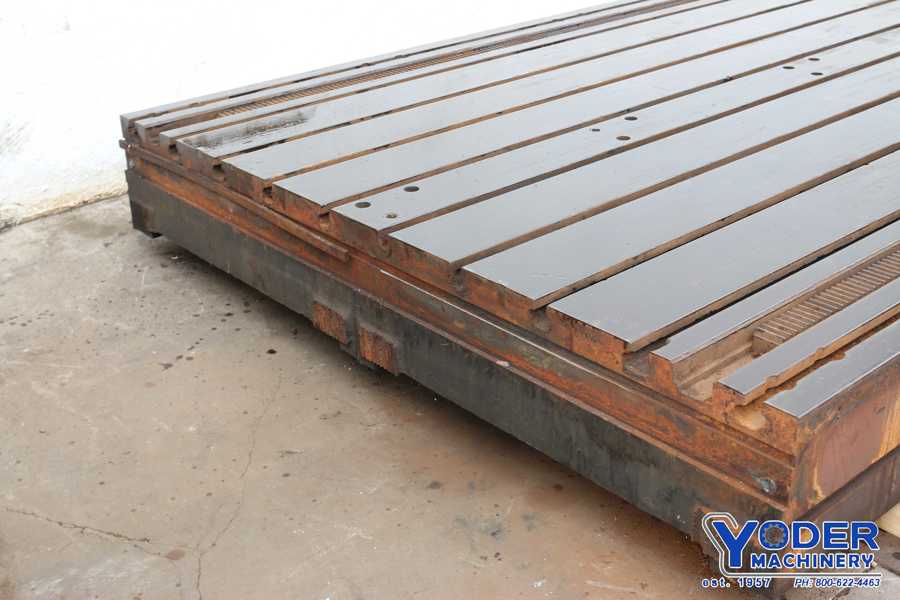 WORKING LENGTH OF PLATE. 180", WIDTH OF PLATE. 96", PLATE THICKNESS. 7", NUMBER OF T SLOTS. 8, T SLOT CENTERS. 12", T SLOT WIDTH AT TOP. 1-1/8", T SLOT DEPTH. 2-2/3", T SLOT WIDTH AT BOTTOM. 2-2/4", AXCESS HOLE IN TOP. 18, LEVLING SCREWS. YES.