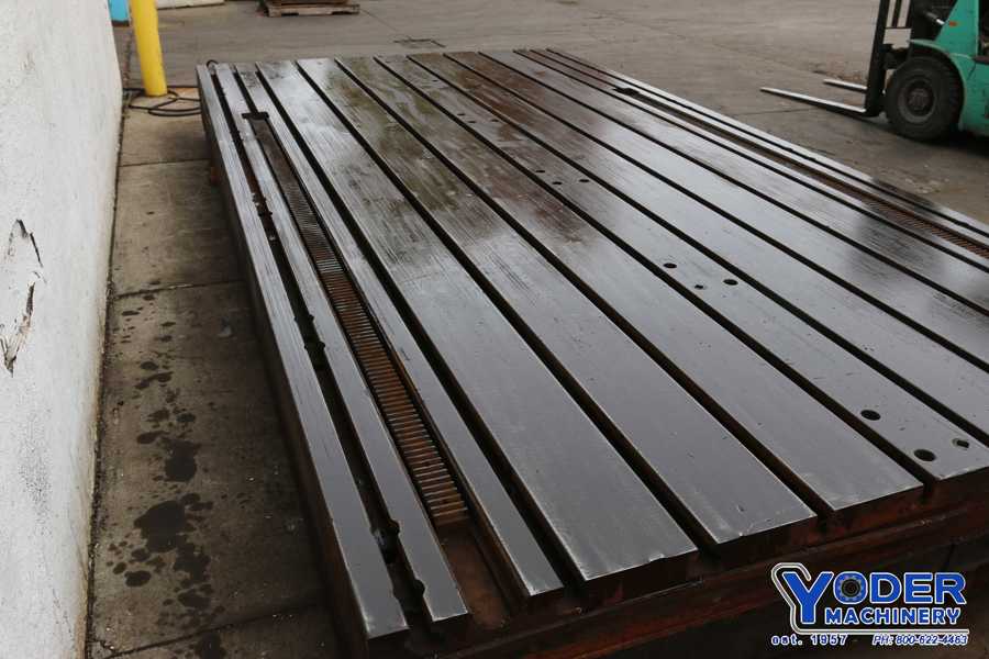 LENGTH OF TABLE. 1192" (16'), WIDTH OF TABLE. 72" (6'), PLATE THICKNESS. 15-1/2", NUMBER OF T SLOTS. 6, T SLOT CENTERS. 12", T SLOT WIDTH AT TOP. 1-1/4", T SLOT DEPTH. 2-1/4", T SLOT WIDTH AT BOTTOM. 2-14", LEVELING HOLES IN TOP. YES.