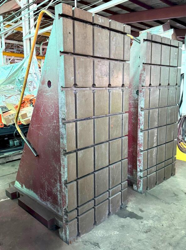 Giddings & Lewis 15′ (180″) x 36″ x 36″ Angle Plate, Pair, on Lower Set:, 2-G&L: 36″ Wide x 96″ Tall x 36″ Deep, Mounted to a T-Slotted Floor Plate: 12′ Long x 36″ Wide x 5″ Thick, 1.5″ T-Slots @ 6″, 18″, 30″ on Floor Plates ...more