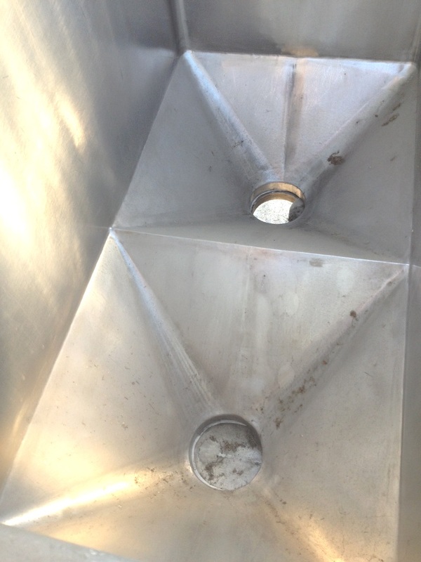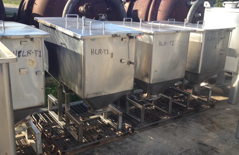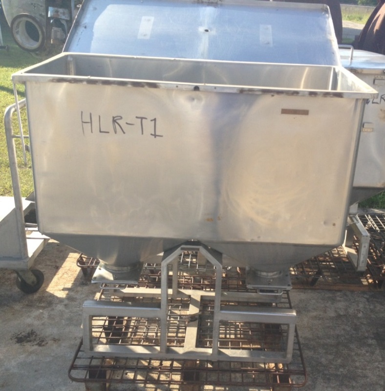 (5) Each, 20 Cu.Ft. (150 Gallon) Stainless Steel Hopper Tanks/tote dual outlet tanks. 23.5" x 4' wide x 2' straight side depth. 47.5" H from bottom of base to top lip (add 5" for metal pallet). (2) Approx. 6" dia. outlets with slide gate valves. Hinged lid.