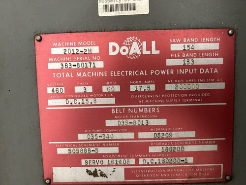 20" DoAll #2012-2H, vertical band saw, 154" blade, #16645 Manufacturer: Doall Model: 2012-2H Max Throat or Width: 20.00 Stock # 16645 Price: $2,500 USD Request Info 8 For Sale by Vander Ziel Machinery Sales Surplus Record Dealer Since 2006 Contact Seller Alto, MI Andy VanderZiel 616-86...> Show Seller's Phone Number 616-868-1111 Let the seller know you found their listing on Surplus Record! View More Vander Ziel Machinery Sales ' ListingsInquire Further with Vander Ziel Machinery Sales! "*" indicates required fieldsName*Company*Email* PhoneZip / Postal Code*QuestionMake an OfferRequests Send me a shipping quote I am interested in financingSend Copy Email me a confirmation of this inquiryBuyer Protection Use our partner Escrow.com to buy or sell equipment safelyBuyer Protection Send me info about buyer protectionThis field is hidden when viewing the formDealer Email Buyers Who Viewed This Listing Also Viewed … 20" x 12" DoAll #2012-2H, vertical band saw, 154" band length, welder/grinder/shear, 5 HP, 1979Category: Vertical Band SawsSeller: Yoder Machinery SalesLocation: Holland, OH Mfr: DoallModel: 2012-2HYear: 1979SERIAL. 383-79123, MODEL. 2012-2H, YEAR NEW. 1979, THROAT, BAND TO COLUMN. 20", MAXIMUM WORK HEIGHT. 12", BAND WIDTH CAPACITY. 1-1/16" TO 1", SAW BAND LENGTH. 154", BAND SPEED RANGE. 5 TO 5200 FPM, VARIABLE, TABLE SIZE. 26-1/2" X 33-1/2", TABLE STROKE. 12", TABLE FEED, HYDRAULIC. 0 TO 6 FPM, TABLE FEEDING FORCE. 0 TO ...moreJUST ADDED! 20" x 25" Marvel #F2150TS2, vertical band saw, 17.6" x .042" x 1.5" blade, 30-650 FPM, hydraulic vise w/ bundling, 2003Category: Vertical Band SawsSeller: Machinery Marketing InternationalLocation: Chicago, IL Mfr: MarvelModel: F2150TS2Year: 200310' Marvel shuttle table, Used Marvel F2150TS2 Vertical Band Saw in excellent condition! Ideal for heavy-duty industrial cutting, this high-performance CNC machine offers precision, durability, and efficiency. Perfect for a wide range of materials. Contact us now for pricing and !, Capacity at 90 Degrees: 20" x ...moreJUST ADDED! 20" x 25" Marvel #81-1,1 Semi-automatic Vertical Bandsaw, 10 HP, 1.25" x 169" blade, 60-400 FPM, Chip Conv., 2003Category: Vertical Band SawsSeller: Southern Fabricating Mchy SalesLocation: Lithia, FL Mfr: MarvelModel: 81-1,1Year: 200320" X 25" Semi - Automatic Mitering Bandsaw with Hydraulic Powered Lift Rollers, Power Vise, Powered Blade Guide Arm, Power Tilt 45° Left or Right, High Column (25") and Manual Chip Conveyor., Throat: 20", Work Height: 25", Power: 10 HP, Blade Width: 1.25", Blade Length: 169" ...moreJUST ADDED! 20" x 12" Powermatic #87, Vertical Band Saw, 1" x 151" bladeCategory: Vertical Band SawsSeller: AuctoLocation: San Francisco, CA Mfr: PowermaticModel: 87- Throat: 20 inches, - Work Height: 12 inches, - Power: 1.5 HP, - Blade Width: 1 inch, - Blade Length: 151 inches, - Dimensions: 33" x 48" x 77", - Weight: 1100 lbs.JUST ADDED! 20" x 24" Amada #VT-5063SW, CNC Vertical Tilt-Frame Bandsaw, 10 HP, 18' 2" x 1-1/2" x 0.05" blade, 220 V., Siemens cnc, Chip Conv.Category: Vertical Band SawsSeller: VX MachineryLocation: Sylvania, OH Mfr: AmadaModel: VT-5063SW, Manufacturer: Amada, Type: Bandsaw, Model: VT-5063SW, Cutting Capacity: 20” x 24”, Main Motor: 10 HP, Weight: 9,000 Lbs, Automatic Indexing: Yes, Blade Size: 18’-2” x 1-1/2” x.05”, Voltage: 220 V, Coolant System: Yes, Work Rest Rollers, Powered Clamp, Upgraded Amada Feed System ...moreShare × "*" indicates required fieldsYour Name*Your Email* Recipient's Email* Note to Recipient