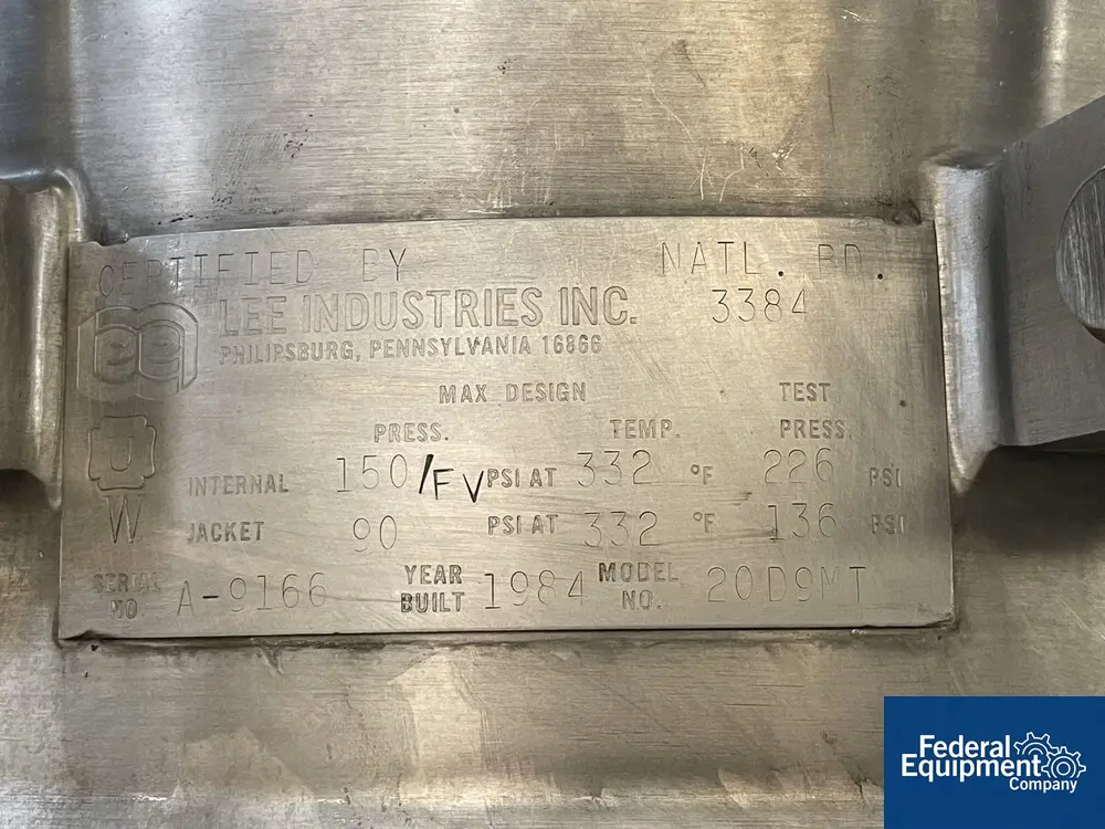 20 gallon Lee, Double Motion Reactor, Stainless Steel, 22" diameter Hinged Top, 150 psi/FV @ 332 F Internal, 90 psi @ 332 F Jacket, 1984