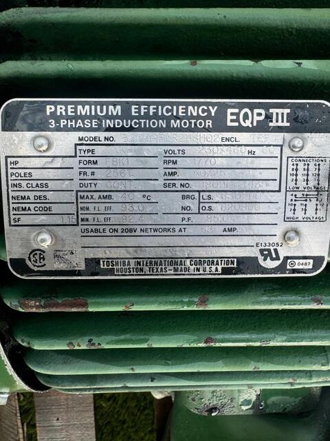 20 HP 1775 RPM Hyundai Crown Triton #PLP256SR235B, Motor, Frame 256T, 3 Phase, 60 Hz, 49.6/24.8 Amps, 230/460 V