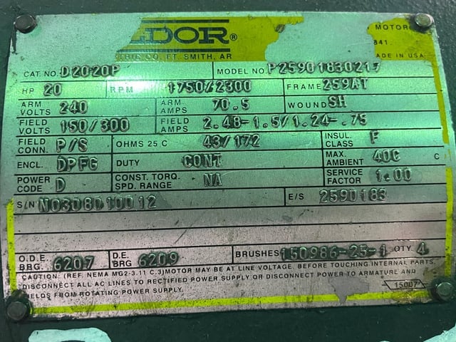 20 HP 1800 RPM Baldor, Frame 259AT, Drip-Proof Ball Bearing, 240 VA, 300/150 VF Manufacturer: Baldor HP: 20 RPM: 1800 - 1800 VA: 240 VF: 150 - 300 Stock # 92932 Request a Quote 3 For Sale by Romanoff Industries Inc Surplus Record Dealer Since 1956 Contact Seller Toledo, OH Jay/Ryan /Aaron 419-78...> Show Seller's Phone Number 419-780-2740 Let the seller know you found their listing on Surplus Record! View More Romanoff Industries Inc 's ListingsDescriptionStock #:92932Category:DC MotorsHP:20RPM:1750Frame:259ATEnclosure:DPBBMake:BaldorArm Volts:240Field Volts:300/150Field Amps:1.24-0.75/2.48-1.5Field Winding:ShuntCondition:Electrically O.K.Location:Toledo, OH Request More Information from SellerGet Your Price from Romanoff Industries Inc! "*" indicates required fieldsName*Company*Email* PhoneZip / Postal Code*QuestionMake an OfferRequests Send me a shipping quote I am interested in financingSend Copy Email me a confirmation of this inquiryBuyer Protection Use our partner Escrow.com to buy or sell equipment safelyBuyer Protection Send me info about buyer protectionThis field is hidden when viewing the formDealer Email Buyers Who Viewed This Listing Also Viewed … 20 HP 1750 RPM Powertron, Frame 328AT, TEFC, 240 VA, 150/300 VFCategory: DC Motors Electrical, 230-250 VoltsSeller: Row Electrical EquipmentLocation: Toledo, OH Mfr: PowertronFrame: 328AT 20 HP 1750 RPM Reliance, Frame 259AT, force vent, foot mount, 240VA, 150VFCategory: DC Motors Electrical, 230-250 VoltsSeller: Industrial Motor ServiceLocation: Anderson, SC Mfr: RelianceFrame: 259AT 20 HP 1800 RPM Reliance, Frame 2112ATCZ, DPFG-BV, 240VA, 150VFCategory: DC Motors Electrical, 230-250 VoltsSeller: Lake City Electric Motor RprLocation: Lake City, SC Mfr: RelianceFrame: 2112ATCZ 20 HP 1750 RPM Reliance, Frame 286A, Drip-Proof Ball Bearing, 240 VACategory: DC Motors Electrical, 230-250 VoltsSeller: Doug Beat CoLocation: Toledo, OH Mfr: RelianceFrame: 286A 20 HP 1750 RPM Reliance, Frame 366A, DP FV, 240 VA, 240 VFCategory: DC Motors Electrical, 230-250 VoltsSeller: Electric Motor ShopLocation: Wake Forest, NC Mfr: RelianceFrame: 366AShare × "*" indicates required fieldsYour Name*Your Email* Recipient's Email* Note to Recipient