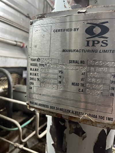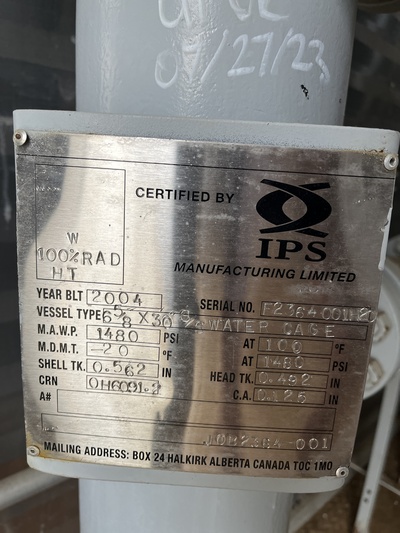 Available for sale: A vertical sour service vessel manufactured by IPS Manufacturing, built in 2004. This portable unit features a diameter of 20 inches and is designed to operate at a maximum temperature of 100°F and a maximum pressure of 1480 psi. Currently located in Blackfalds, AB, Canada, the vessel is in disconnected operational status and has a separator length of 8 feet.