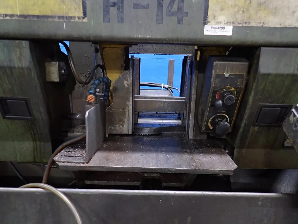 SERIAL. 499.058, MODEL. H-14, YEAR. 1999, CAPACITY. 14" X 14", BLADE SIZE. 15'4" X 1-1/4", BLADE SPEEDS. 50 TO 350 SFM, BUNDLING ATTACHMENT. YES, POWER DOWN FEED. YES, POWER CLAMPING. HYDRAULIC, BLADE TENSION. HYDRAULIC, CONTROL. CNC LENGTH & CUT QUANTITY, SHUTTLE STROKE. 34", TABLE HEIGHT. 31", COOLANT. YES ...more