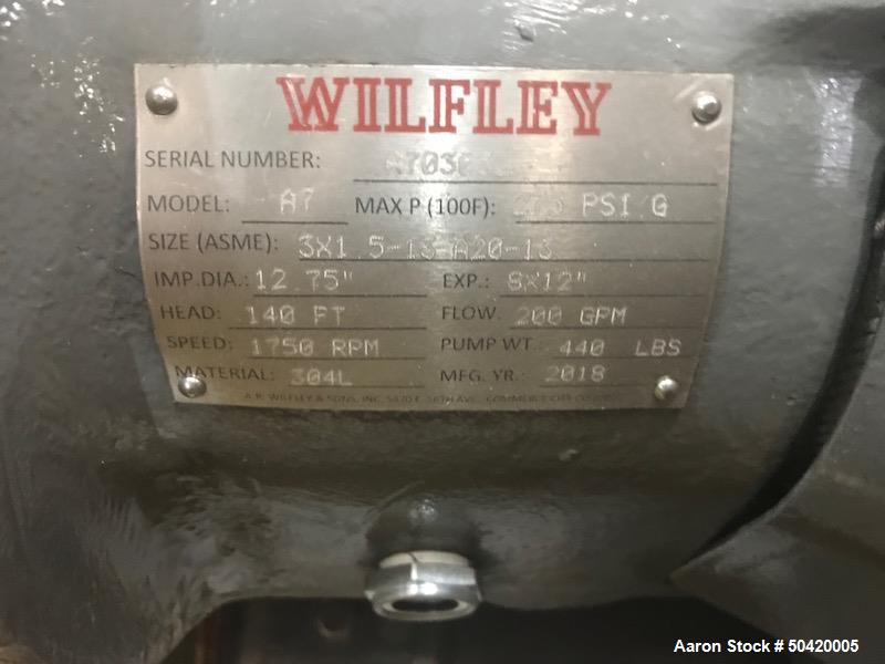 unused- wilfley pump, model a7, 304l stainless steel. size 3x1.5x13. approximate 200 gallon per minute. 140 foot head. driven by a 30 hp, 3/60/460 volt, 1775 rpm motor. jacketed casing. serial # a703032. built 2018.