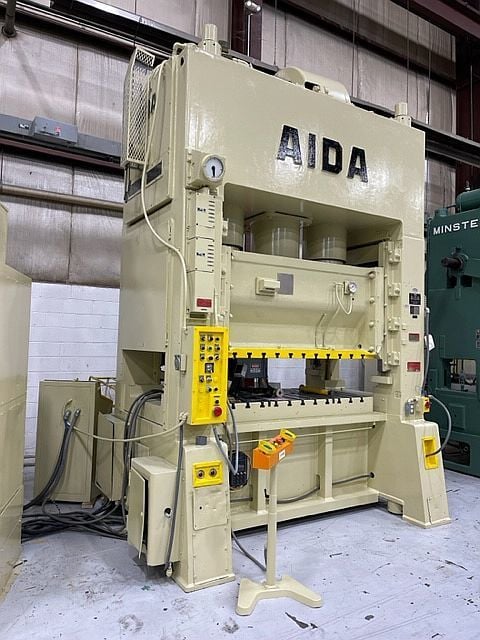 200 Ton, Aida #PDA-20M, straight side double crank press, 5.9" stroke, 23.7" Shut Height, air clutch & brake, 48-120 SPM