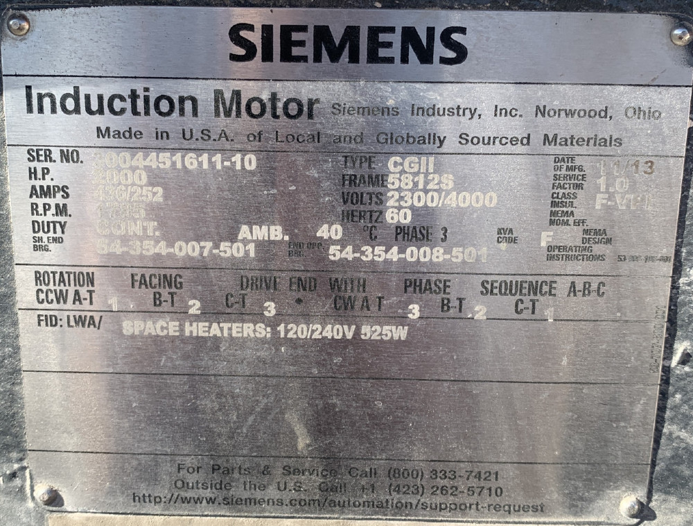 2000 HP 3585 RPM Siemens & Rel., Frame 5812S, WPIISB, 1.15SF, 2300/4000 Volts (3 available)