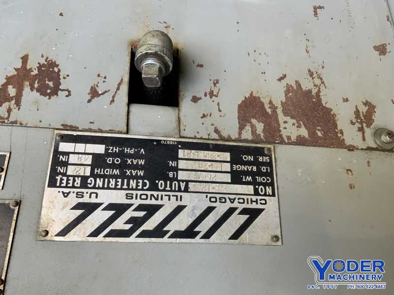 2000 lb. Littell #20-12, uncoiler, 18" mandrel, 12" width, 48" outside dimensions, 16"-20" ID, 3 keepers, manual expansion, electric drag brake, 1981