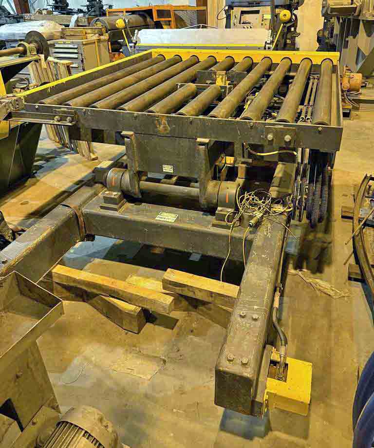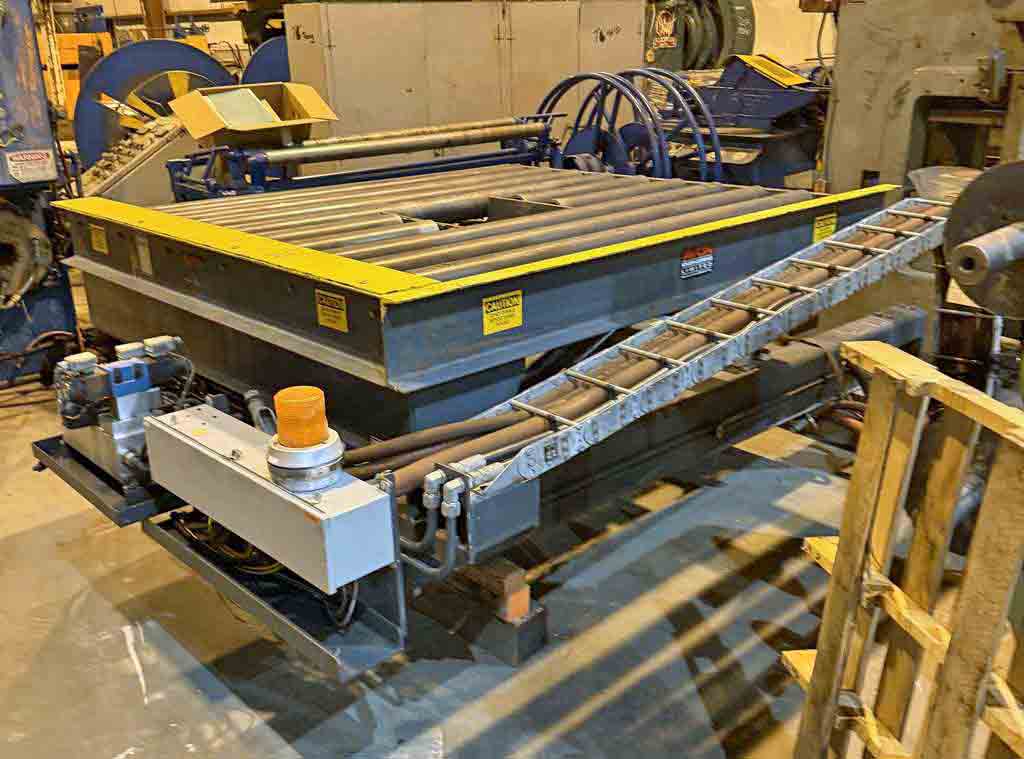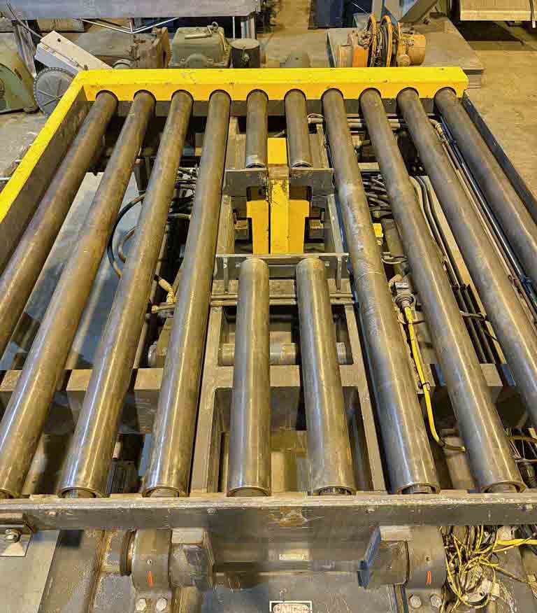 , 10,000# capacity, Has Pick and Place capability, Hydraulically powered conveyor rolls, 3.5" dia. x 76" face rolls on 6.5" centers, 1 3/8" Round shafts, 81" table length, 36.75" conveyor pass height when lowered, 61.75" from floor to top of horn when raised, 5" wide x 8" ...more