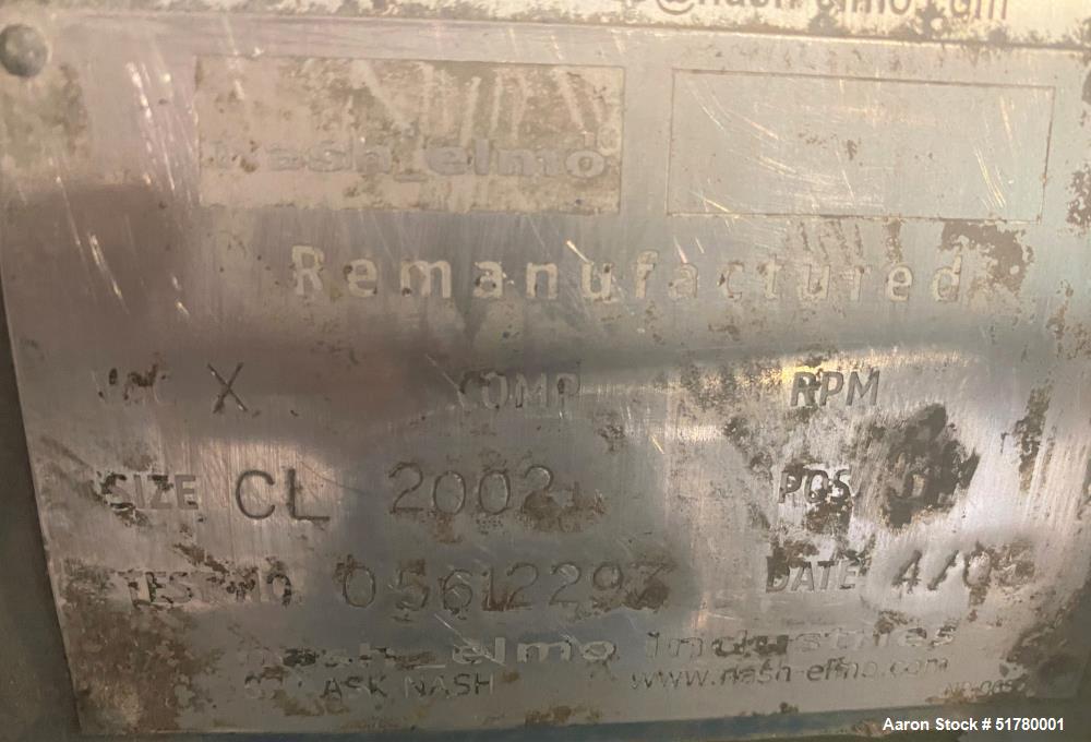 used- nash elmo cl series liquid ring vacuum pump, model cl-2002, carbon steel. approximate capacity with a 125hp motor is 2120 cfm at 15" hg. 6" inlets, 5" outlets. requires a motor. test# 05612293, rebuilt 2005.