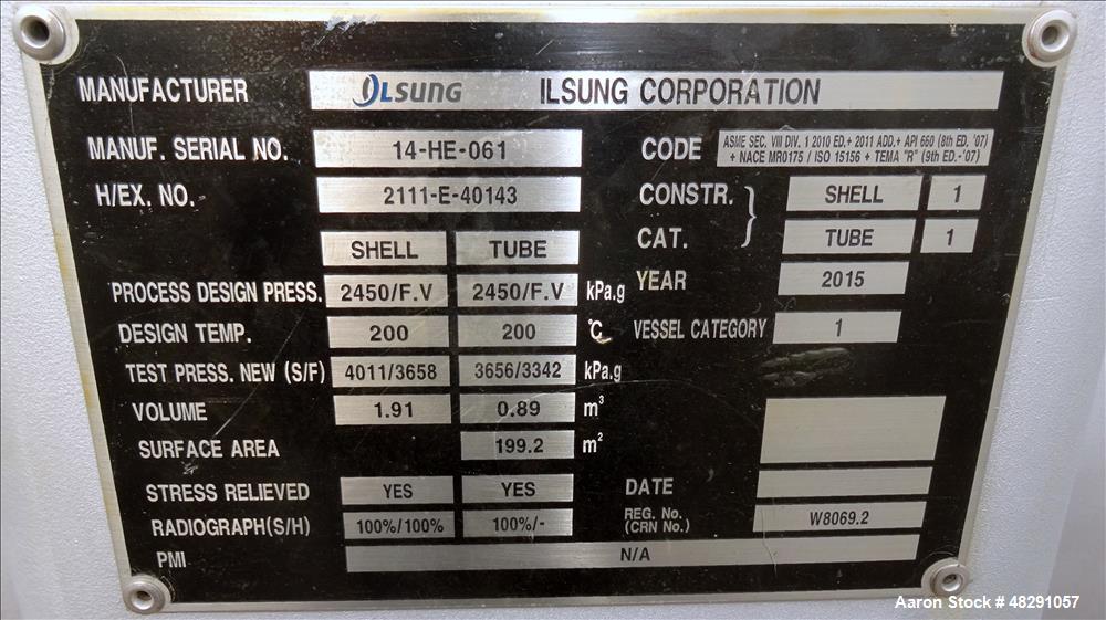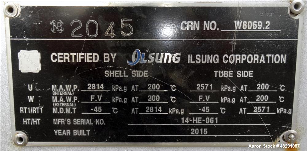 2143 sq.ft., 412FV psi shell, 372FV psi tube, Ilsung, 4" inlet & outlet tube nozzles, (2)2" vents, 392°F, 2015