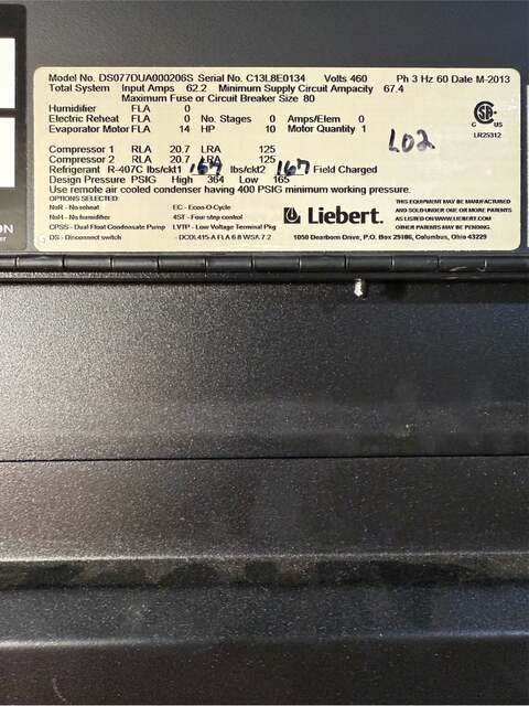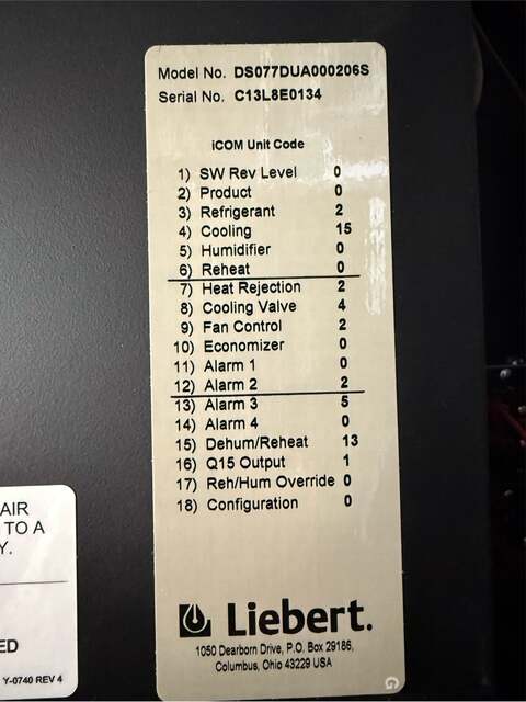 22 Ton Liebert DS077D, CRAC, 460 VAC, R407C, 2013 Manufacturer: Liebert Year: 2013 Ton: 22 Stock # 110355 Price: $9,000 USD Request Info 5 For Sale by Quantum Technology Surplus Record Dealer Since 2024 Contact Seller Shippensburg, PA Sales Dept. 484-74...> Show Seller's Phone Number 484-749-8600 Let the seller know you found their listing on Surplus Record! View More Quantum Technology 's ListingsDescription Details*Local Pickup Does Not Include any Palletization* '*Handling times for freight shipments average 5 days, but may vary depending on size, weight, location, and current trucking conditions. This does not include shipping time.*Please be aware that item descriptions are provided as-is without any warranties or guarantees of accuracy. We strongly recommend using this content as a starting point for further research and consultation with relevant experts or authorities. We disclaim any liability for damages or losses resulting from the use or reliance on this content.We can ship international freight. Please contact us if you have any questions or issues checking out.IMPORTANT: The sale includes only items in the picture. No other accessories not in the picture are included. If you feel something is missing please reach out to us before buying. No returns will be accepted due to items not in the picture. Thanks for your understanding.The equipment is used, as such it may have some blemishes, light surface scratches not affecting operation. If you need more details about your particular equipment, please email with questions.Generators do not ship with batteries due to DOT regulations.Datacenter and computer equipment we sell does not include hard drives. Request More Information from SellerInquire Further with Quantum Technology! "*" indicates required fieldsName*Company*Email* PhoneZip / Postal Code*QuestionMake an OfferRequests Send me a shipping quote I am interested in financingSend Copy Email me a confirmation of this inquiryBuyer Protection Use our partner Escrow.com to buy or sell equipment safelyBuyer Protection Send me info about buyer protectionThis field is hidden when viewing the formDealer Email Buyers Who Viewed This Listing Also Viewed … 22 Ton, Liebert, CW084D, CRAC Chilled Water Down Flow AC, 460 Volts, 3PH, 2012 (8 available)Category: CRAC Systems (Computer Room Air Condit...Seller: Quantum TechnologyLocation: Shippensburg, PA*Handling times for freight shipments average 5 days, but may vary depending on size, weight, location, and current trucking conditions. This does not include shipping time.* Please be aware that item s are provided as-is without any warranties or guarantees of accuracy. We strongly recommend using this content as a ...more 22 Ton, Liebert #DS077A, CRAC, R407C, 3PH, 460 Volts, 2017Category: CRAC Systems (Computer Room Air Condit...Seller: Quantum TechnologyLocation: Shippensburg, PAModel: DS077AYear: 2017*Local Pickup Does Not Include any Palletization* '*Handling times for freight shipments average 5 days, but may vary depending on size, weight, location, and current trucking conditions. This does not include shipping time.* Please be aware that item s are provided as-is without any warranties or guarantees of ...more McLean #G521216G050, Electronic Enclosure Air Conditioner, R-134A, 12000/12500 BTU Cooling, 400/150 psig, 50/131 °F, 3.5/3.7 kW, 115 VCategory: CRAC Systems (Computer Room Air Condit...Seller: HGR24Location: Euclid, OH Mfr: McleanModel: G521216G050Inventory No. 0420-060-0862 Manufacturer Mcclean Model No. G521216G050 Name Electronic Enclosure Air Conditioner Arrival Date 10-03-2025 Dimensions L x W x H (inches) Unavailable Capacity 12000/12500 BTU Electrical 1/50/60/115 Weight (lb.) 140 Category Electrical Condition Used Available Quantity 1 Serial No. ...moreShare × "*" indicates required fieldsYour Name*Your Email* Recipient's Email* Note to Recipient