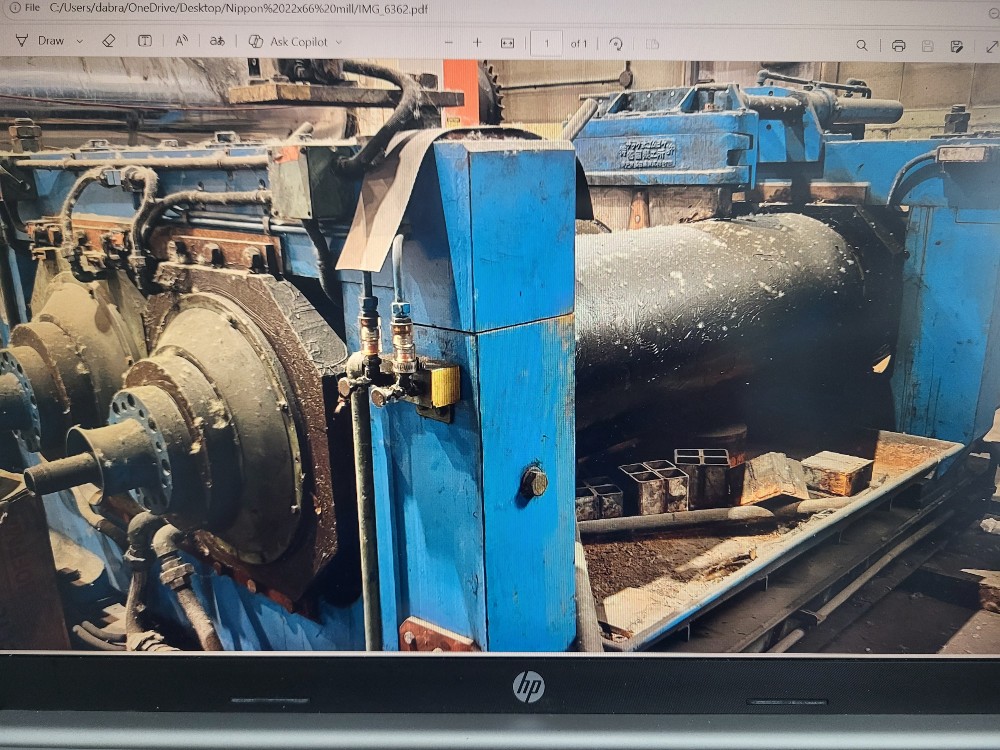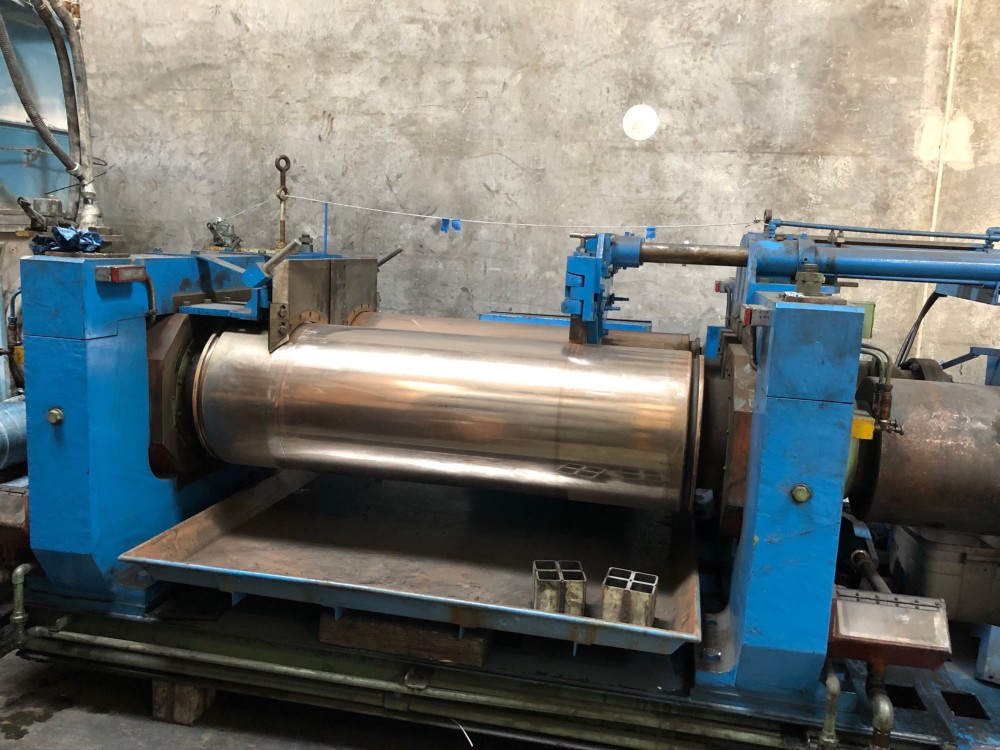 1-Nippon 22" x 22" x 66" two roll rubber or silicone mill. Direct connected and unitized on a two piece base. Each roll driven via parallel shaft Hansen reducers with separate 60HP variable speed DC motors and SCR's. 120HP total horsepower. This produces variable speed and friction up to 24 RPM on either the front or rear roll. Mill has "ANTI-FRICTION" roller bearings on both the front and rear roll journals. Front roll is triple pass "drilled" for best heating or cooling capability. Rear roll is cored. Front roll is adjusted via individual motorized roll adjusters. Hydraulic stock pusher and power unit. Manual tilting guides on water side. Automatic oil lubrication.