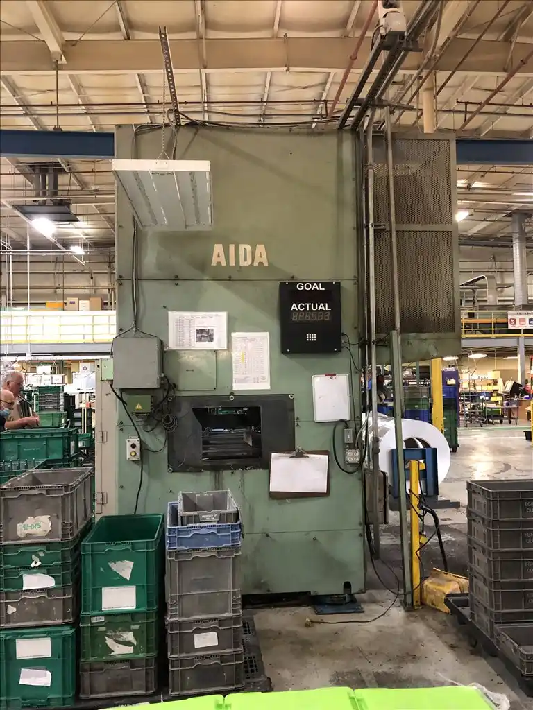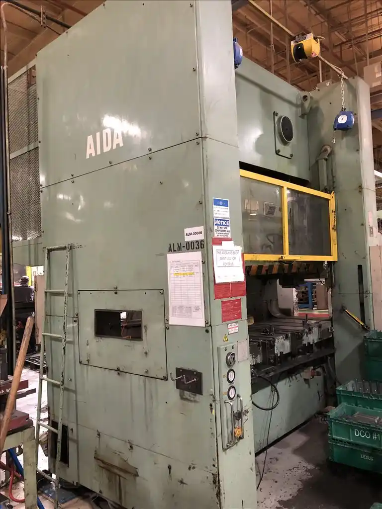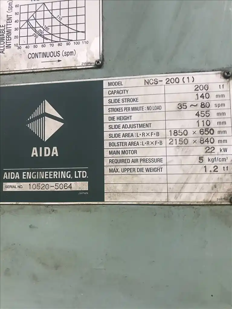 220 Ton, Aida #NCS-200(1), straight side double crank press, 5.51"stroke, 17.91"Shut Height, 4.33"adj., 35 - 80 SPM, 84.65"x33.07"bed, 33" window, air cooled & brake, 1999