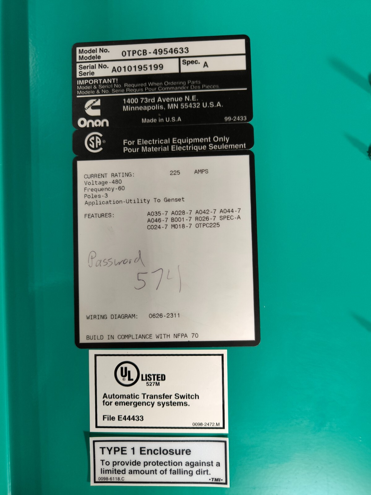 Onan Cummins OTPCB-5602349 0306-4404-08 Automatic Transfer Switch 225A 208V 60Hz 3P 3PH Type 1Enclosure.