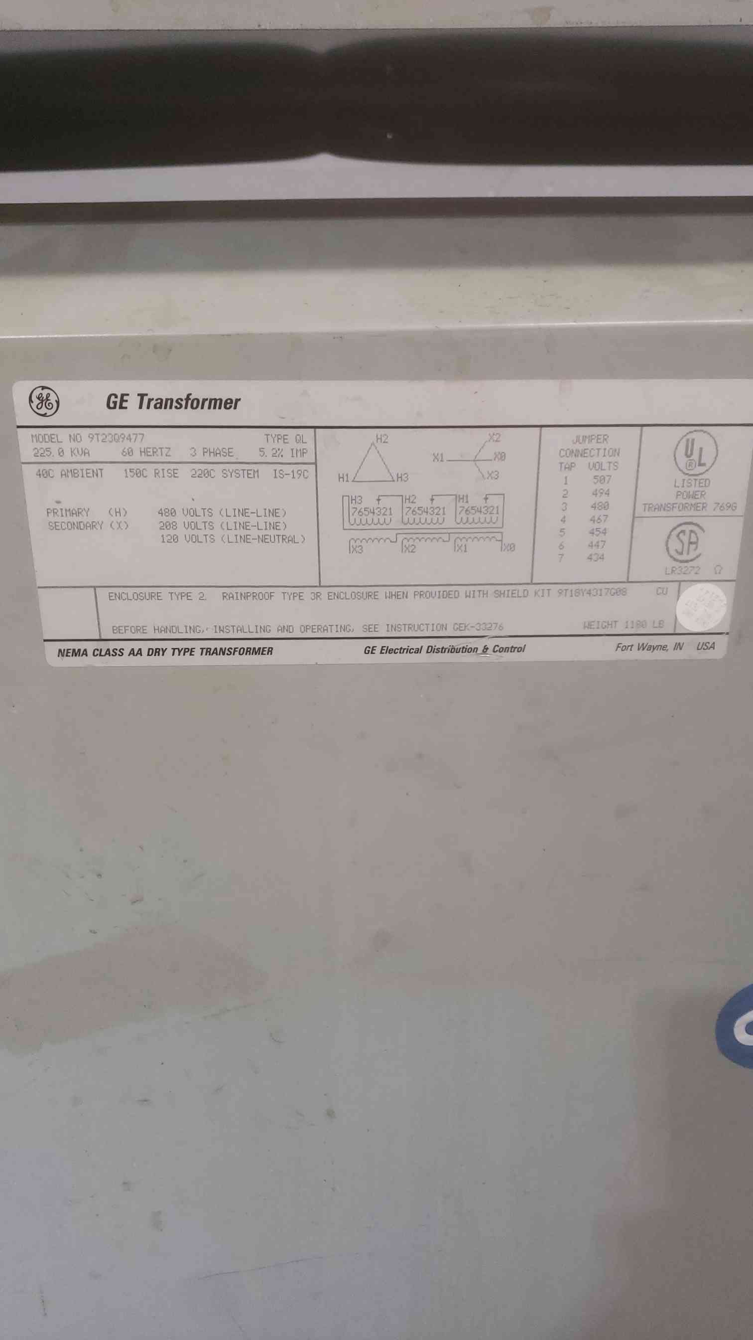 225 KVA, 480 Primary, 208/120 Secondary General Electric #9T23Q9477, Transformer, 3PH, Type 2 encl Manufacturer: General Electric kVA: 225.0 Primary Voltage: 480 Secondary Voltage: 208 - 120 Stock # 110821 Price: $1,900 USD Request Info 3 For Sale by Quantum Technology Surplus Record Dealer Since 2024 Contact Seller Shippensburg, PA Sales Dept. 484-74...> Show Seller's Phone Number 484-749-8600 Let the seller know you found their listing on Surplus Record! View More Quantum Technology 's ListingsDescription Details*Local Pickup Does Not Include any Palletization* '*Handling times for freight shipments average 5 days, but may vary depending on size, weight, location, and current trucking conditions. This does not include shipping time.* Please be aware that item descriptions are provided as-is without any warranties or guarantees of accuracy. We strongly recommend using this content as a starting point for further research and consultation with relevant experts or authorities. We disclaim any liability for damages or losses resulting from the use or reliance on this content. We can ship international freight. Please contact us if you have any questions or issues checking out. IMPORTANT: The sale includes only items in the picture. No other accessories not in the picture are included. If you feel something is missing please reach out to us before buying. No returns will be accepted due to items not in the picture. Thanks for your understanding. The equipment is used, as such it may have some blemishes, light surface scratches not affecting operation. If you need more details about your particular equipment, please email with questions. Generators do not ship with batteries due to DOT regulations. Datacenter and computer equipment we sell does not include hard drives. Request More Information from SellerInquire Further with Quantum Technology! "*" indicates required fieldsName*Company*Email* PhoneZip / Postal Code*QuestionMake an OfferRequests Send me a shipping quote I am interested in financingSend Copy Email me a confirmation of this inquiryBuyer Protection Use our partner Escrow.com to buy or sell equipment safelyBuyer Protection Send me info about buyer protectionThis field is hidden when viewing the formDealer Email Buyers Who Viewed This Listing Also Viewed …JUST ADDED! 225 KVA, 480 Primary, 208Y/120 Secondary I-T-E 3F3Y225, Transformer, 3PHCategory: 60 Hz Three Phase TransformersSeller: Quantum TechnologyLocation: Shippensburg, PA*Local Pickup Does Not Include any Palletization* '*Handling times for freight shipments average 5 days, but may vary depending on size, weight, location, and current trucking conditions. This does not include shipping time.* Please be aware that item s are provided as-is without any warranties or guarantees of ...moreJUST ADDED! 225 KVA 480 Delta Primary, 208Y/120 Secondary, 3 phase, Dry Type Transformer, Ready To ShipCategory: 60 Hz Three Phase TransformersSeller: Maddox Industrial TransformerLocation: Battle Ground, WAJUST ADDED! 225 kVA, 480 Primary, 208Y-120 Secondary Siemens 3F3Y225BESCLN3D16, Transformer, 3RCategory: 60 Hz Three Phase TransformersSeller: OK Sales IncLocation: Burlington, NC Mfr: Siemens225 kVA Siemens 3F3Y225BESCLN3D16 Transformer 480V Primary 208Y-120V Secondary, Please review all photos and video carefully. The item shown is the exact unit you will receive. This listing reflects a decommissioned industrial asset sold as-is. Confirm compatibility and condition using the visual documentation and any ...more 225 KVA 480 Primary, 208/120 Secondary, Bemag UC3225P480K13, dry type isolation transformerCategory: 60 Hz Three Phase TransformersSeller: C3 Surplus LLCLocation: Miami, FL Mfr: BemagOVERVIEW, BEMAG Dry Type Isolation Transformer - Model UC3225P480K13, Standard BSN130411-05A-1, 225 kVA capacity, manufactured in Canada. Professional-grade three-phase isolation transformer featuring 480V primary voltage, dual secondary voltages of 120/208V, Class 220 insulation system with 150°C temperature rise ...more 225 KVA 480 Primary, 208Y/120 Secondary, General Electric 9T23Q9567G13ACategory: 60 Hz Three Phase TransformersSeller: Equipment Recovery CorpLocation: Willoughby, OH Mfr: General ElectricShare × "*" indicates required fieldsYour Name*Your Email* Recipient's Email* Note to Recipient