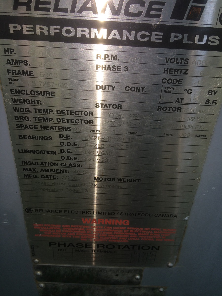 2250 HP 1788 RPM Westinghouse, Frame 6810L, weather protected enclosure type 1, 2300/4000 Volts