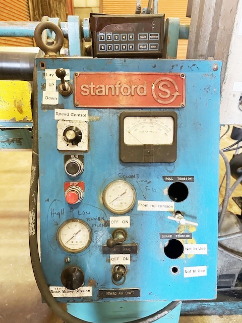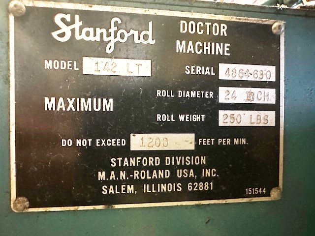 Used 24" Wide Stanford Roll Doctor Machine. Model 142LT, serial #4864630. Unwind/Rewind good for 24" diameter rolls. Maximum roll weight 250 lbs. Maximum 1200 feet per minute. Drive by a 5 hp motor with speed controls.