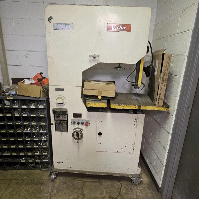 24" x 12" Victor #DCM-6, Vertical Band Saw w/T-Slot Table, 23.5" x 19.5" x 40" H Table, (2) 16.5" & (1) 12" diameter Wheels, 155.5" L x 5/8" width Blade, 65-1600 FPM, 2 HP, new