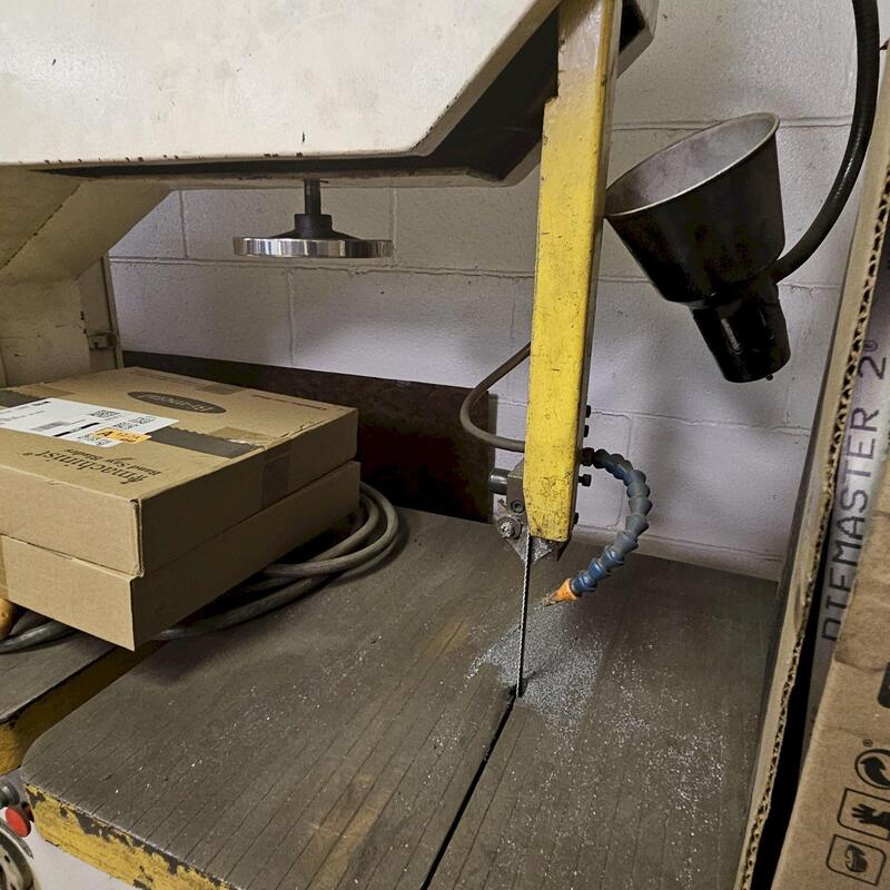 , Used GROB 4V-24 Vertical Band Saw with 24" throat depth and blade welder. s include 3 HP motor, 12" max work height, and variable speed up to 5000 FPM. Table tilts 45 right and 5 left, supported by a robust 4-speed transmission., Spec Sheet:, Grob 4V-24 Band Saw w/ 24'' Throat Depth, Blade Welder, Throat ...more