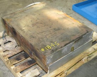 HEATED AREA IS 24" X 30" X 4.5" THICK. F TO B OVERALL IS 32.75". TWENTY 0.5" DIAMETER CARTRIDGE HEATERS (2 ROWS OF 10); 240 VOLTS; 1150 WATTS; PART #8321. TWO THERMOCOUPLE PORTS. QTY 2. ITEM #1845.