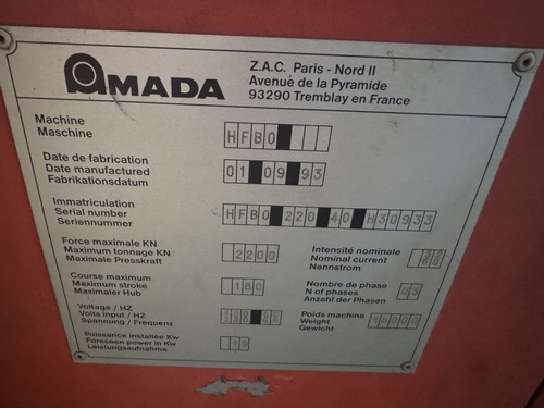 Year: 1995, Make: Amada, Model: HFB-2204, Tonnage: 242 Tons, Overall Length: 168", Between Housing: 148", Stroke: 7.8", Open Height: 18.5", Weight: 36,000lbs, Dimensions: 187" x 82" x 120"H, Operateur Control, 5 Axis Backgauge, 2 Finger assemblies, Foot Pedal, Misc Punch Holders ...more